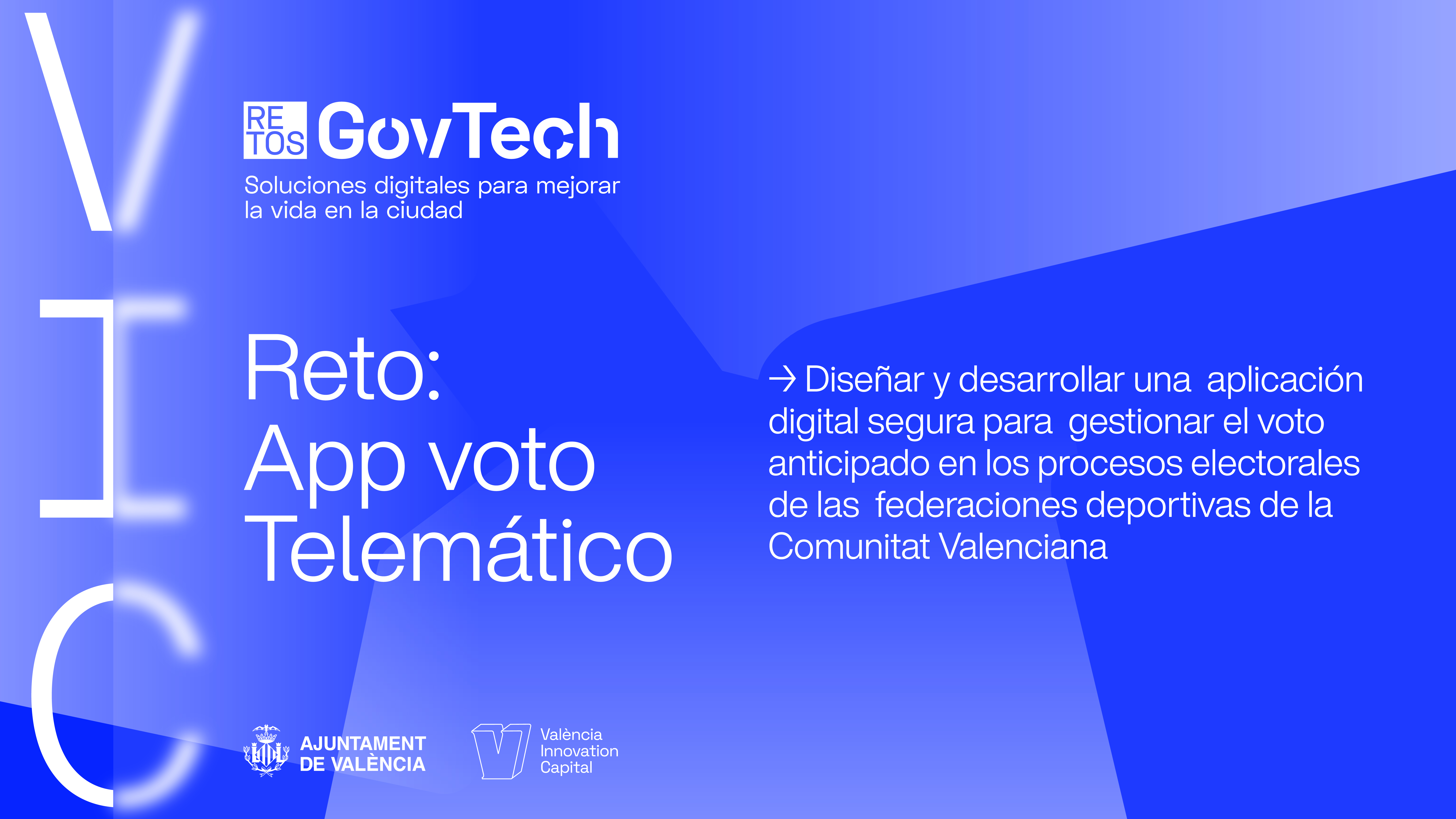 L’Ajuntament de València, a través de València Innovation Capital, llança un nou repte GovTech: App Vot Telemàtic, l’objectiu del qual és dissenyar i desenrotllar una aplicació digital segura, interoperable i escalable per a gestionar el vot anticipat telemàtic en els processos electorals de les 58 federacions esportives de la Comunitat Valenciana.