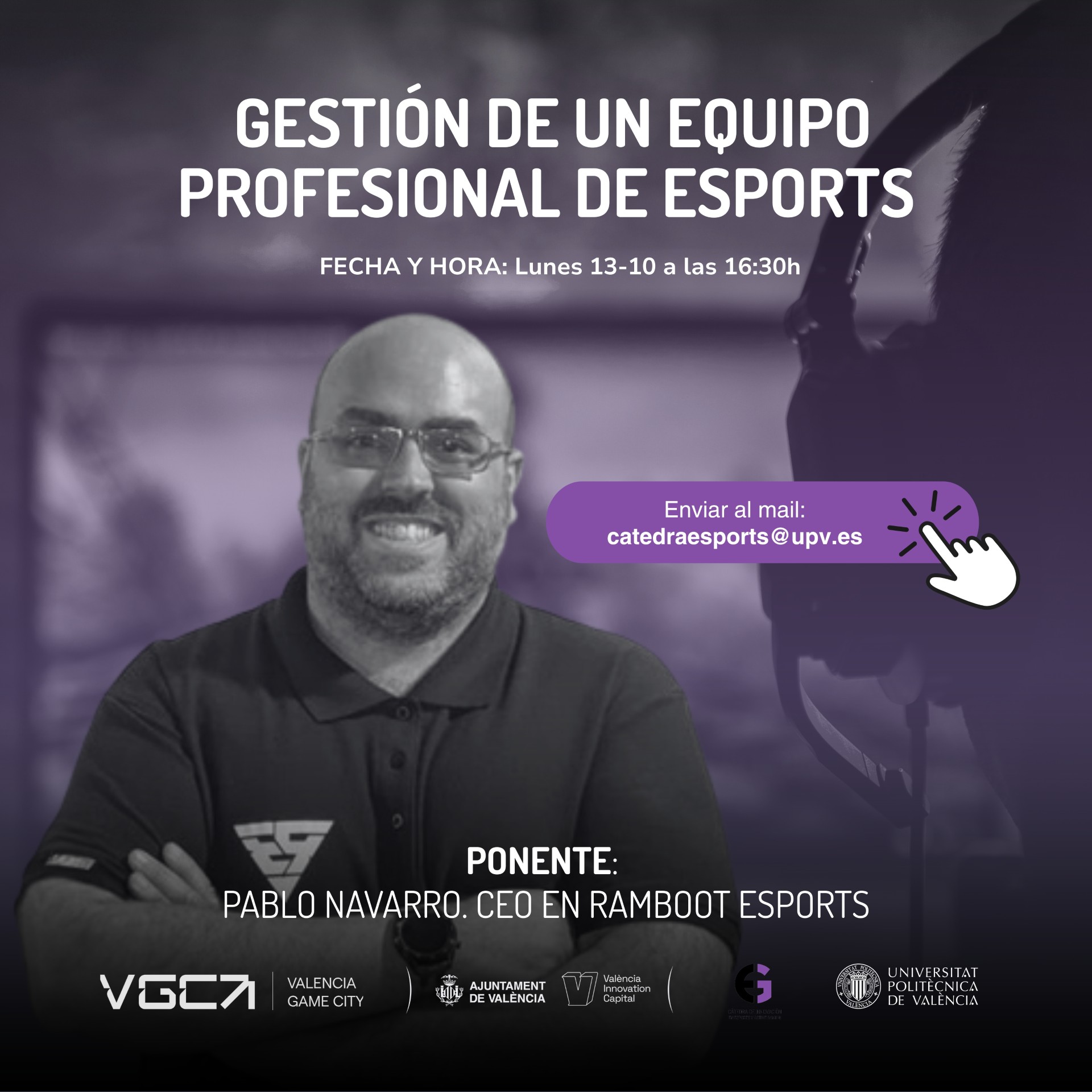 En el marco de las actividades que lleva a cabo la Cátedra de Innovación en Esports y Active Gaming, el próximo 13 de octubre tendrá lugar en el Aula 2-11 del Centro de Formación Permanente de la UPV el seminario “Gestión de un equipo profesional de esports”, que correrá a cargo de Pablo Navarro, CEO en Ramboot Esports, club valenciano referente en el ecosistema español.