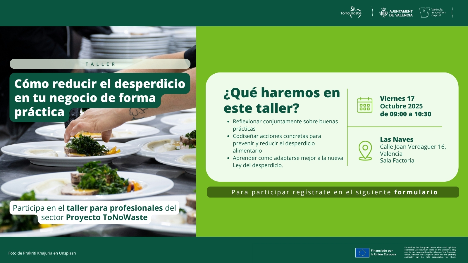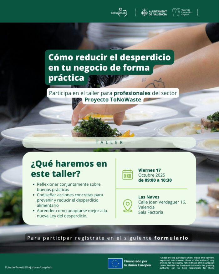 El proyecto europeo ToNoWaste y València Innovation Capital organizan el taller “Cómo reducir el desperdicio alimentario en tu negocio de forma práctica”, dirigido a profesionales.