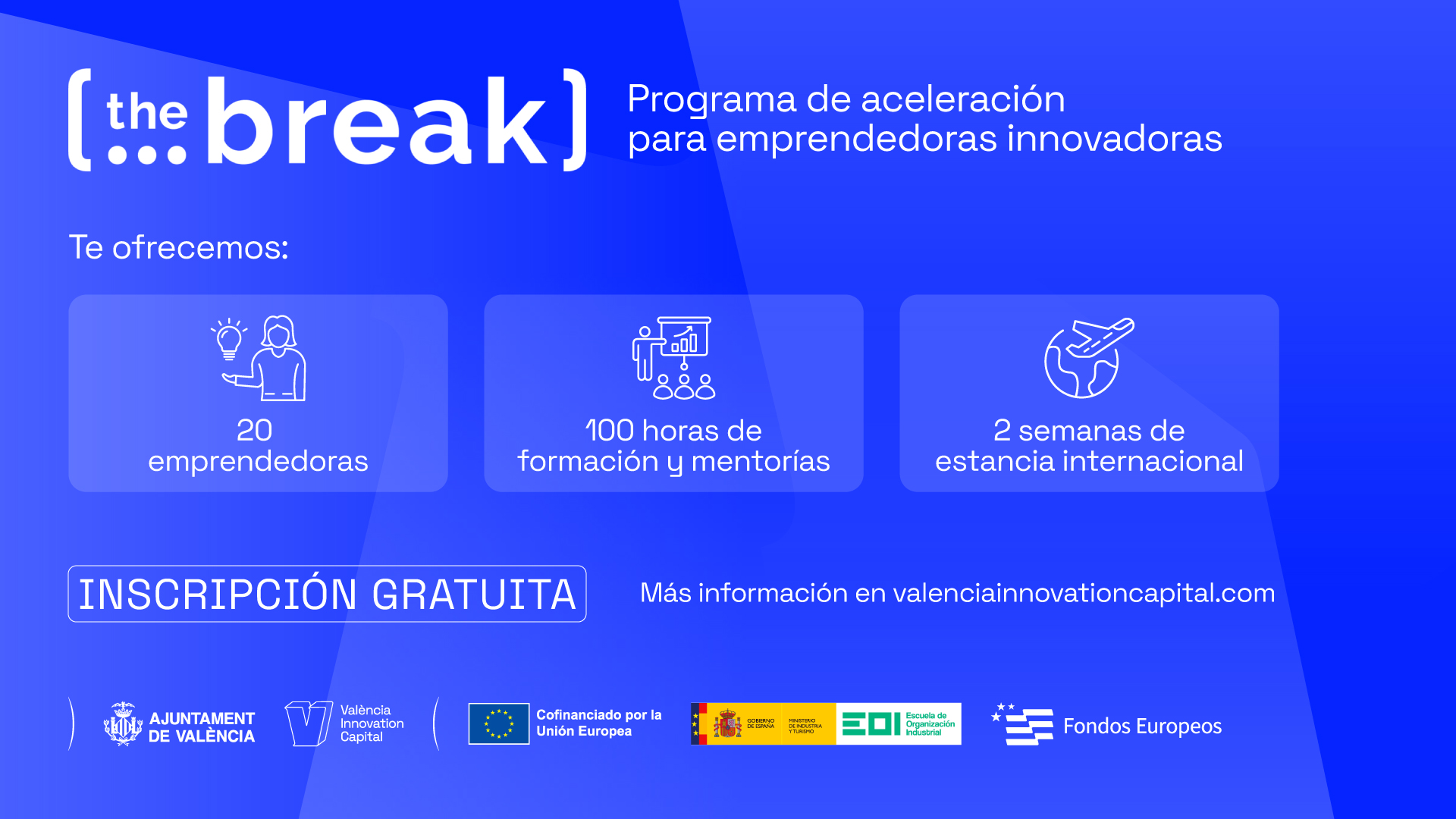- València Innovation Capital, en colaboración con la Escuela de Organización Industrial (EOI), lanza la segunda edición de The Break Valencia, un programa dirigido a mujeres emprendedoras que lideran proyectos de impacto y quieren fortalecer sus iniciativas desde el ecosistema innovador de la ciudad